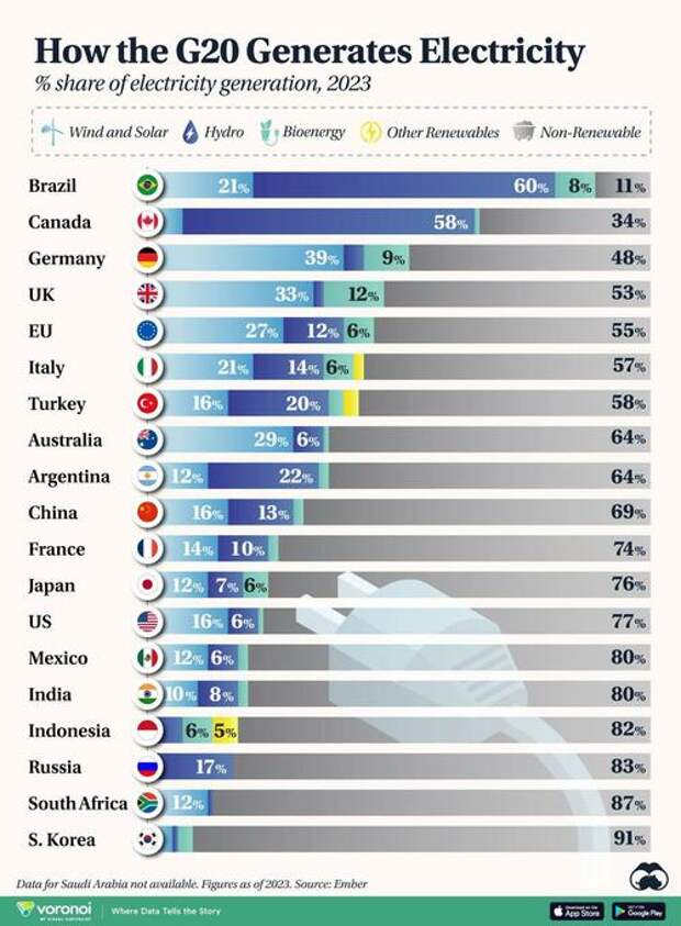 This graphic, via Visual Capitalist's Bruno Venditti, shows how much electricity is generated from renewable sources among G20 countries.