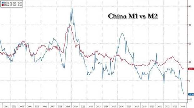 According to Goldman, the September credit data indicated credit demand of private sectors remained weak: household loan growth remained low, and corporate loan growth moderated. Money supply data were mixed: M1 stock still experienced a deep contraction, but M2 growth picked up in September (as a reminder, M1 has to surpass M2 for China to even have a hope of a successful reset). The Securities Times reported that the rise of M2 growth was driven by inflows into bank deposits and margin deposits, thanks to the stock market rally in late September; of course, the subsequent drop means that M2 will promptly reverse. More importantly, the deep M1 contraction still signals likely disinflationary pressures in the coming months.