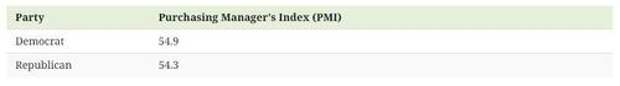 A score of below 50 represents deteriorating sentiment and a score of above 50 means sentiment is improving.The average PMI under Republican presidents since 2000 is 54.3 versus 54.9 for Democrats—nearly identical and both in expansion terrain.