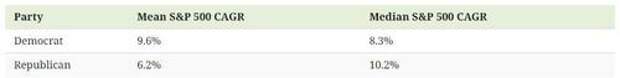 The mean compounded average annual growth rate (CAGR) with Democratic presidents is slightly higher than with Republican presidents. Median performance, however, is higher under Republican presidents.