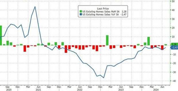 US Existing Home Sales rose (+1.3%MoM) for the first time in five months in July, but remain down 2.5% YoY (the last time home sales were up YoY was July 2021)...