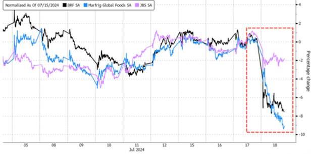 The highly transmissible virus, which doesn't affect humans, sent shares of major producers in the country tumbling since the news broke Thursday. Shares of BRF SA dropped by 7.5%, Marfrig Global Foods SA slid 9%, and JBS SA fell about 2%.