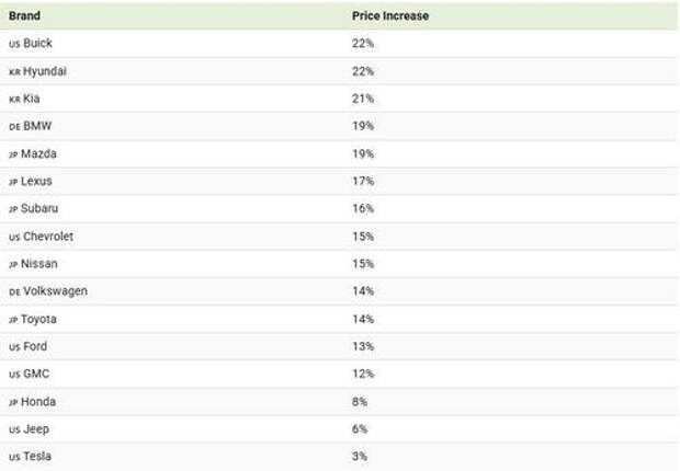 Although Buick is an American brand, the company produces many of its models in China and South Korea. As a result, Buick tops this list with a 22% projected price increase—the highest among all brands surveyed.