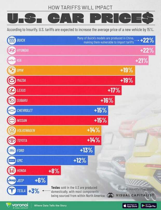 The data for this visualization comes from Insurify, which projected price increases for various car brands based on their exposure to overseas manufacturing and parts.