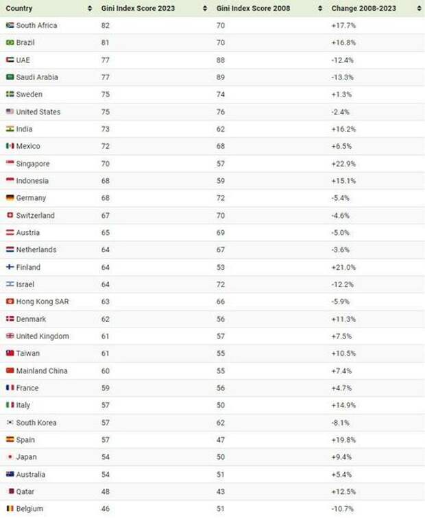 In this index, scores closer to zero indicate more equal wealth distribution, while a score of 100 indicates that one individual holds all the wealth.Here are Gini index scores across select countries, highlighting how they have changed over time: