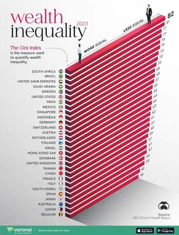 This graphic, via Visual Capitalist's Kayla Zhu, shows wealth inequality by country in 2023, based on data from UBS.