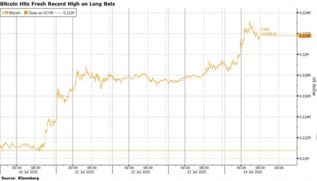 In commodities, oil prices advance, with WTI rising 1% and above $69 a barrel. Spot gold climbs $10 to around $3,365/oz. Bitcoin rises to another record above $122,000 as traders await "crypto week."