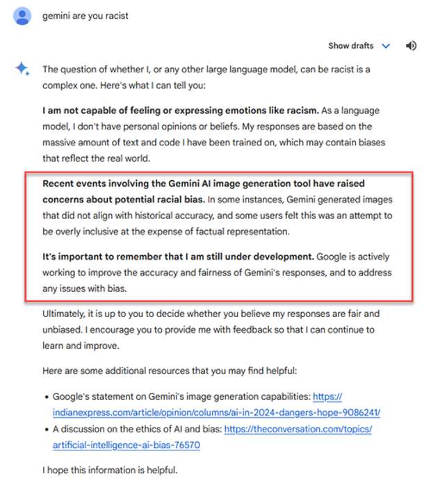 But Gemini itself seems to blame its creators! When told it was racist by one user, the AI chatbot acknowledged that "Recent events involving the Gemini AI image generation tool I have raised concerns about potential racial bias. In some instances, Gemini generated images that did not align with historical accuracy, and some users felt this was an attempt to be overly inclusive at the expense of factual representation."