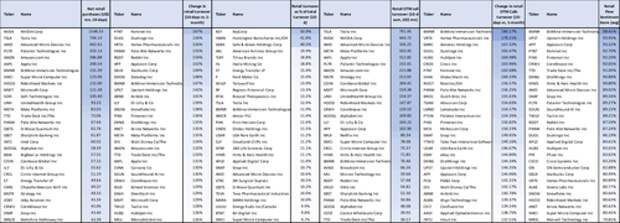 In the US, retail interest in TSLA is still high, although as the latest retail flow tracker from Vanda Research shows, net retail purchases in the name are less than half of Nvidia's which is the category leader. And while OTM call turnover in TSLA among retail investors remains the highest of all stocks, retail flow sentiment in the name has clearly soured with TSLA no longer appearing in the top 30 names.