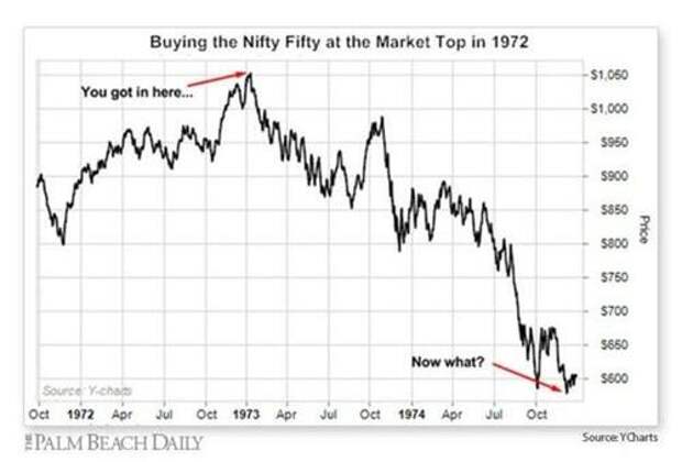 The graph below, courtesy of YCharts and the Palm Beach Daily, shows the 40+% decline in the Nifty Fifty from 1973 to late 1974.