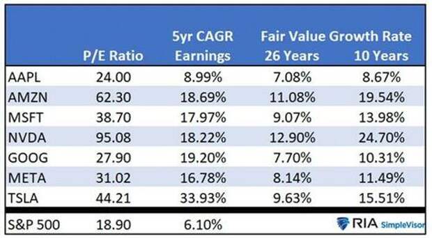 Unlike Siegel, we do not have the benefit of future data to tell us whether the Magnificent Seven is in a bubble or appropriately priced for future earnings growth. However, we can use his logic and appreciate the earnings growth rates implied by current valuations.