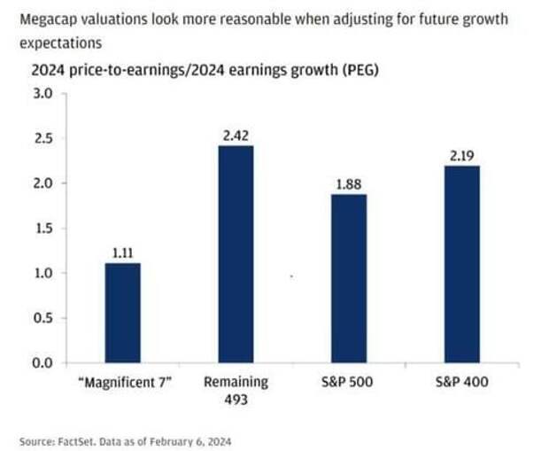 The graph below, courtesy of FactSet, shows that the high P/E ratios of the Magnificent Seven in aggregate may not be out of line with the market when one considers their earnings growth projections.