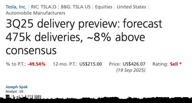 UBS: Tesla 3Q25 Delivery Forecast