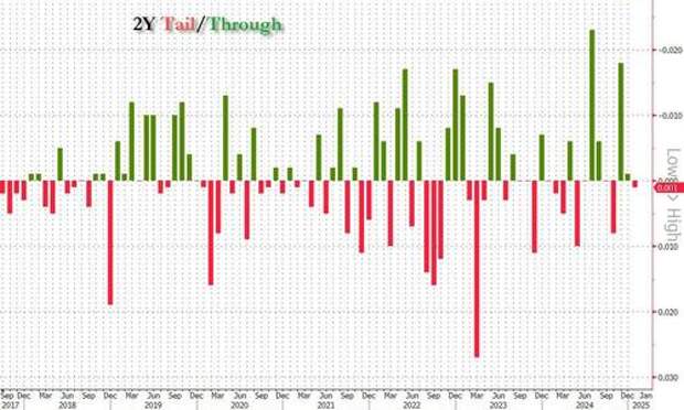 211%. Courtesy of the sharp jump in Treasuries in the past week and especially today, this was 12 bps below last month's stop of 4.335%, however, it tailed the When Issued 4.210% by 0.1bps, the first tail on 2Y paper since Oct 24.The bid to cover dipped from 2.73 to 2.66, the lowest since October and just below the six-auction average of 2.68.