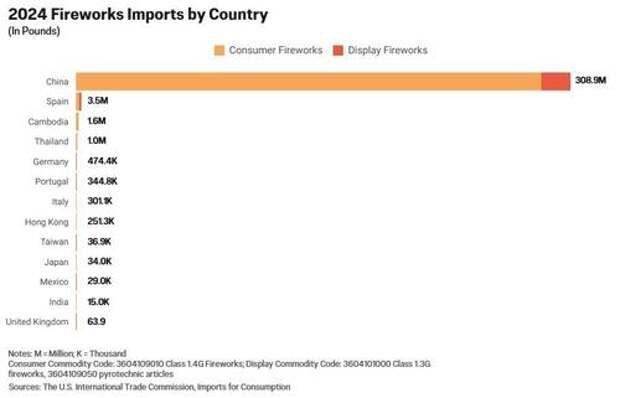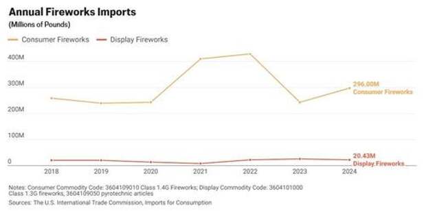 6 percent in 2024. Meanwhile, display fireworks imports declined to an all-time low in 2021, a 62 percent decrease from 2019, but rebounded to more than 20 million pounds in 2022.U.S. fireworks companies rely almost entirely on China, which produces 99 percent of consumer fireworks and 90 percent of professional display fireworks, according to the American Pyrotechnics Association. In 2024, China accounted for 98 percent of total fireworks imports to the United States.