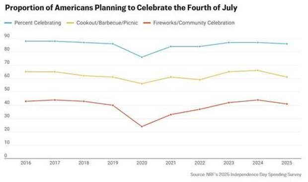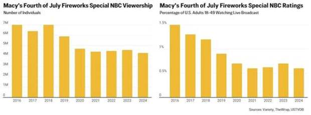 By June 2022, 38 states had ended their COVID-19 emergency declarations and the country experienced record levels of imported fireworks.Fewer Americans are tuning in to the Macy’s Fourth of July Fireworks Special on NBC, compared to a decade ago. Broadcast viewership dropped 20 percent annually between 2018 and 2020, but has stabilized at an average of 4.4 million viewers over the past four years. Meanwhile, ratings among adults aged 18-49 have declined, from 1.5 percent a decade ago, to 0.6 percent in 2024.