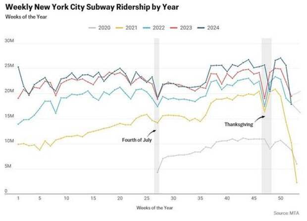 Over the past three years, New Yorkers have taken fewer subway rides during the week of the Fourth of July holiday, with an average decline of 15 percent compared to June totals. July ridership rebounded after the holiday week, at an average increase of 11.8 percent. During Thanksgiving week, subway ridership also decreased, falling by 21 percent compared to typical weeks in November.