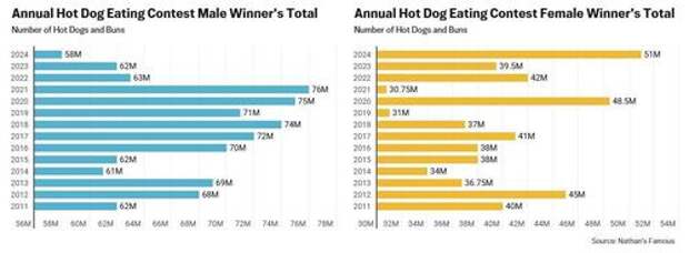 In 2021, Joey Chestnut set a new record eating 76 hot dogs and buns in 10 minutes in the Nathan’s Famous Hot Dog Eating Contest held on Coney Island, New York, every July 4. After his record-setting performance, men’s totals slightly declined in subsequent years. The women’s record of 51 hot dogs was set by Miki Sudo in 2024, and marked her 10th title.
