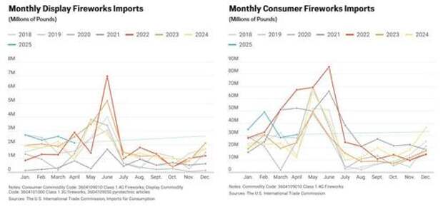 Fireworks imports typically have a seasonal peak in May or June, with the highest monthly imports recorded in June 2022. The 2022 rebound resulted primarily from the post-pandemic recovery.