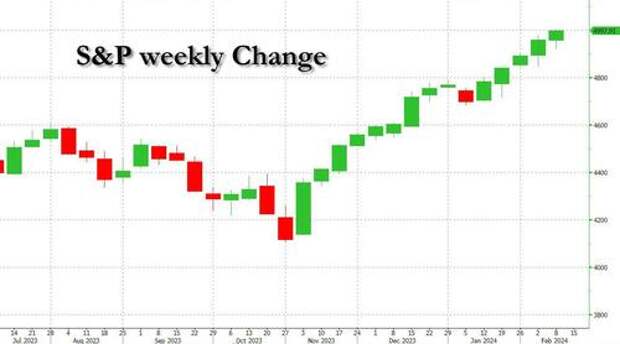 Back to markets, on Thursday the S&P 500 briefly hit 5,000 for the first time after a massive buy program lifted the market as if just for that one reason, before closing little changed. US equities have posted only one weekly drop since late October and the gauge has more than doubled from its March 2020 pandemic-low — driven by expectations for a soft economic landing and optimism about the impact of artificial-intelligence.