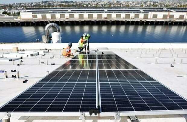 Workers install solar panels on a rooftop at the Port of Los Angeles, in Los Angeles on April 21, 2023. Mario Tama/Getty Images