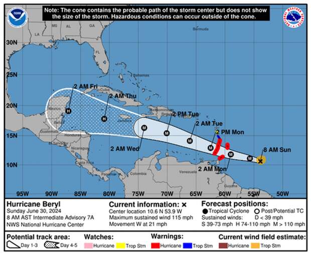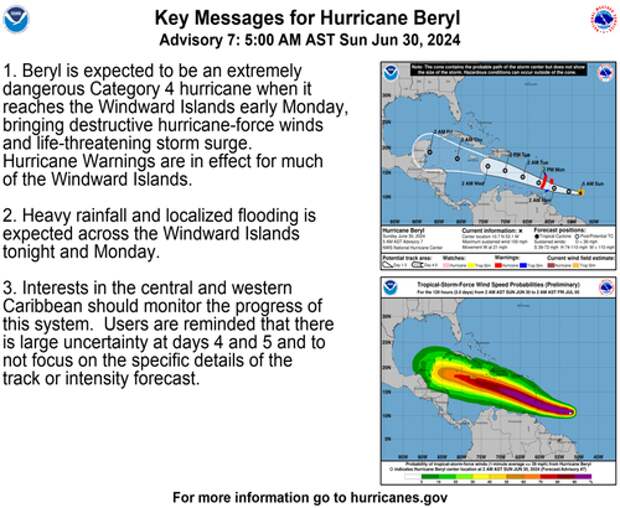 "Hurricane Beryl is expected to be an extremely dangerous Category 4 hurricane when it reaches the Windward Islands early Monday," the National Hurricane Center wrote in a message on Sunday.