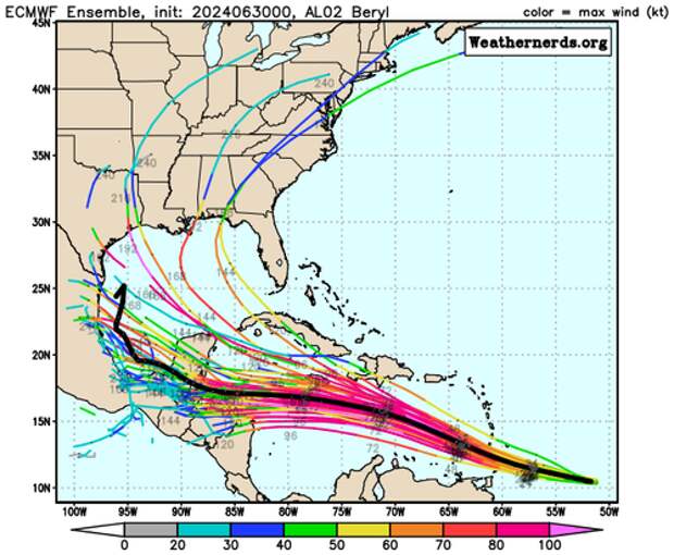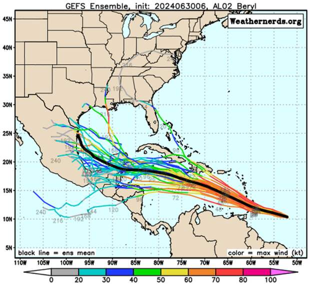 The storm will weaken by the end of the week but remain a hurricane as it churns toward the Yucatán Peninsula.The ECMWF Ensemble and GEFS Ensemble shed more color on Beryl's potential future track. These models indicate that the storm's potential track could shift north after landfall around the Yucatán Peninsula and, after that, move towards the US Gulf Coast, where major refineries are located.