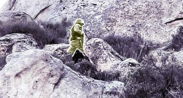 On Feb. 29, a Mexican soldier hides behind a rock as he realizes reporters have seen him on the U.S. side of the border. Several moments later, he ducks back under the barbed wire fence into Mexico.