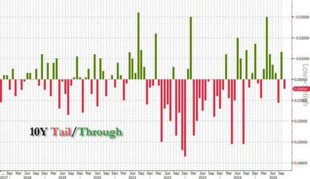 117%, up from 4.033% in Sept, but except for that one month, it was the lowest since Oct 2024. The auction also tailed the 4.114% When Issued by 0.3bps, following last month's stop and was the 2nd tail in the last 8 auctions.The bid to cover dropped from 2.65% to 2.478%, which while not the worst in the past year wasn't too far off, and was well below the 2.57 six-auction average.