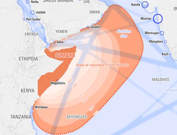 Map showing extent of Somali piracy in prior years, which greatly expanded in range from 2005 to 2010...