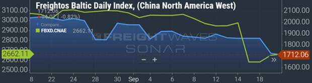 The Freightos Baltic Daily Index (FBX) spot assessment for the Asia-North America West Coast lane has fallen 16% over the past month, to $1,712 per forty-foot equivalent unit as of Thursday. The FBX Asia-North America East Coast assessment is down 13% over the past month, to $2,662 per FEU.