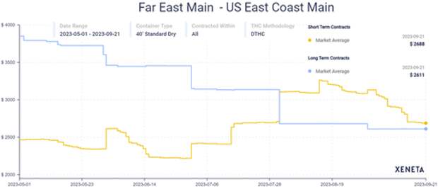 Xeneta data shows that average short-term (spot) rates in the Asia-East Coast trade were an impressive $580 per FEU higher than average long-term (contract) rates on Aug. 15.