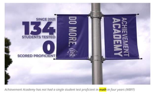 And the school gets a lot of taxpayer money to achieve that vision. According to state data, in 2021, Achievement Academy received $20,014 for each one of its 372 students. By 2024, Achievement Academy had an enrollment of 202 and received $42,618 per student. In other words, over those four school years, Achievement Academy's per student funding more than doubled and not one student, over those years, tested proficient on the state math exams.