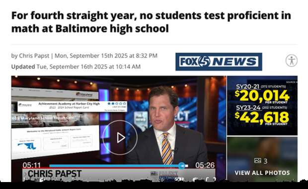 President Trump's executive order earlier this year to dismantle the Department of Education comes as the president highlighted a disturbing and inconvenient truth about Baltimore City's Democratic Party-run "failure factory" school system: 40% of public high schools have zero students proficient in math. This damning statistic follows eight years of Fox45 investigative reporter Chris Papst's coverage of the crime-ridden city's education crisis.