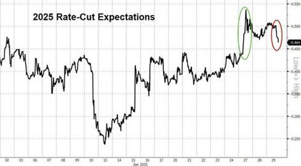 President Trump has mentioned his desire for "much lower" interest rates but we would not expect Powell to show his hand at all (indeed it would very out of character) with forward-guidance expectations now perfectly in line with The Fed's dotplot expectations for 2025.