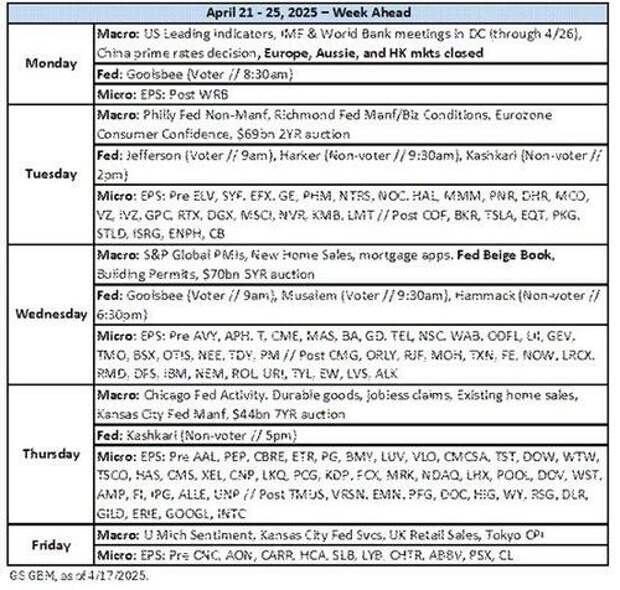 Apart from economic data, notable events next week include the 2025 Spring Meetings of the World Bank and the IMF on April 21-26, in Washington, D.C. The IMF will release its full World Economic Outlook and Global Financial Stability reports on Tuesday.