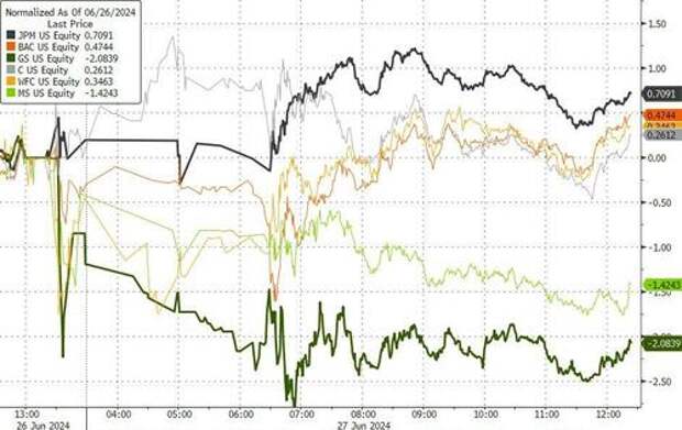 Bank stocks were mixed after the stress tests (GS down on ccard losses, JPM up on strong capital, which ironically they came out and said was too generous)...