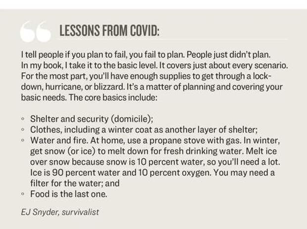 Mr. Snyder: Seventy-two hours isn’t going to do squat! You should stock three meals per day for each person in your family, plus snacks and one gallon of water per day per person—enough to last for 90 days. Then, add enough for another person who might knock at your door. You can help your neighbor out. If you have to stretch it out, do one meal a day.