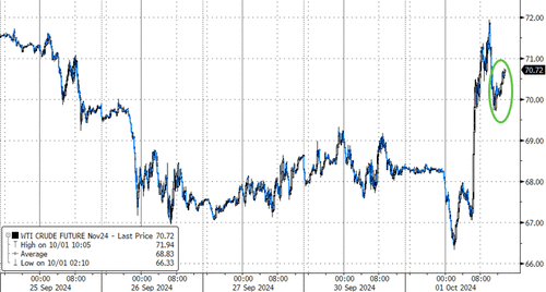 Oil prices surged today as the record spec shorts suddenly realized that the Middle East is shitshow of geopolitical bomb fuses just ready to be lit. WTI spiked dramatically up near $72 on the Iranian missile attack in Israel before fading back a little