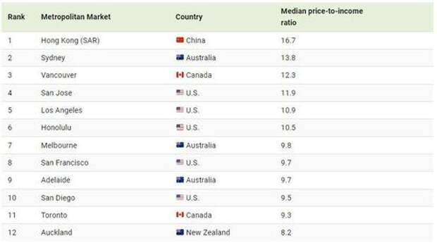 We can see that the top city in this ranking, Hong Kong, has a ratio of 16.7. This means that the median price of a home is 16.7 times greater than the median income.