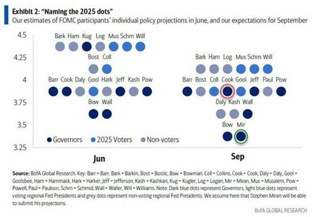 One thing is certain: Miran will vote for a 25bps rate cut, and may even vote 50, and he won't be alone since both Waller and Bowman may do the same. Which means that on Wednesday history may be made when we get a four-way vote split: uber doves voting for a 50bps rate cut, Powell and the "moderates" voting for 25bps. Then you have the hard-line pro-Biden supporters (sorry guys, hate to break it to you, but the Fed - which until recently was tasked with enabling a green agenda and social "equity" - has never been and never will be independent) like Goolsbee and Hammack, who may vote to keep rates unchanged, and there is the Lisa Cook wildcard, who may decided to go scorched earth and to vote for a 25bps rate hike.