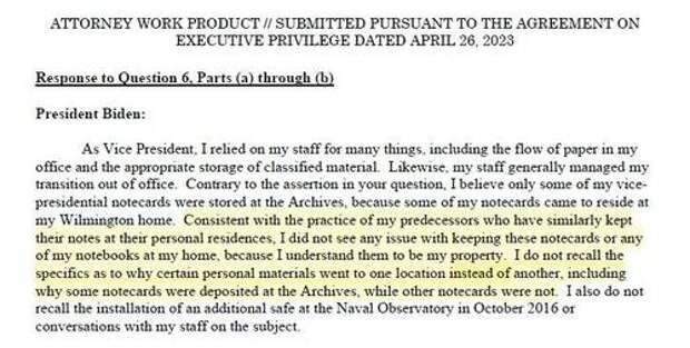 And finally, Biden explains that his possession of classified materials (notecards) should be deemed appropriate because he understood them to be his “property.”