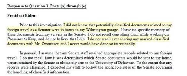 (Our recap into the Biden classified documents saga goes into greater detail.)The issue with Biden’s handling of classified materials wasn’t necessarily the possession of those materials, though that is a criminal offense. It’s that he lied about it to Special Counsel Hur. These written answers - first published in this article - are important in that they are made with thought and care, as compared to Biden’s rambling interview with Special Counsel Hur, where he was a bit slow and forgetful.