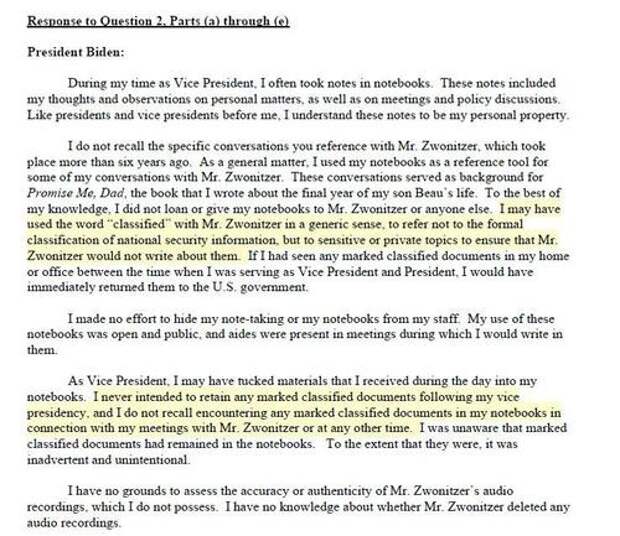 Here, you see Biden explaining he used the term “classified” with his ghostwriter (Zwonitzer) in a generic sense. However, in a recorded February 2017 interview, Biden told his ghostwriter that he had “just found all the classified stuff downstairs.” Biden was also found to have read “verbatim” from a number of classified notebooks and remarked to his ghostwriter that some of the documents “may be classified.”