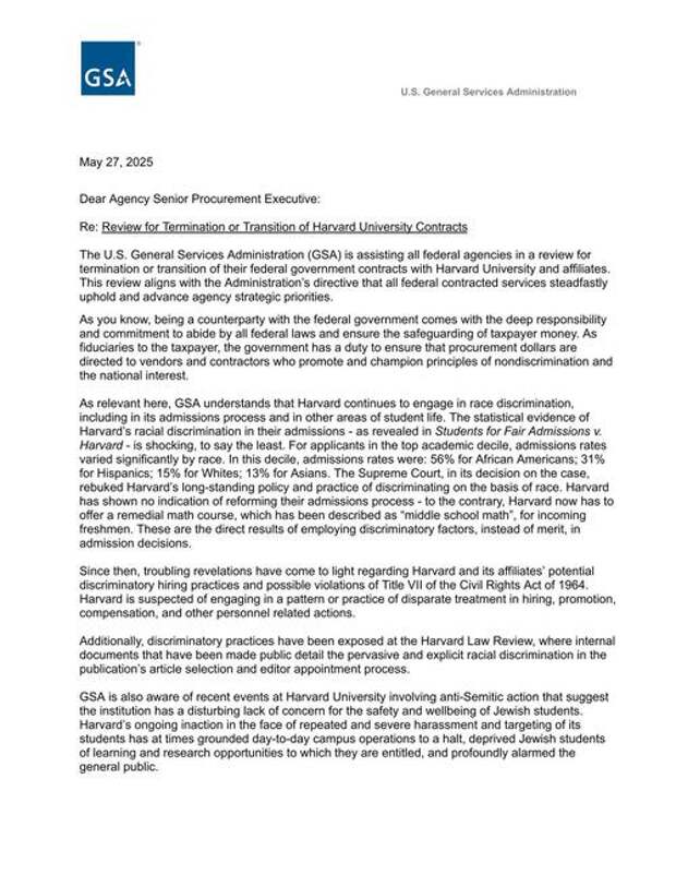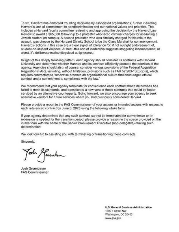 "Going forward, we also encourage your agency to seek alternative vendors for future services where you had previously considered Harvard," the letter states.