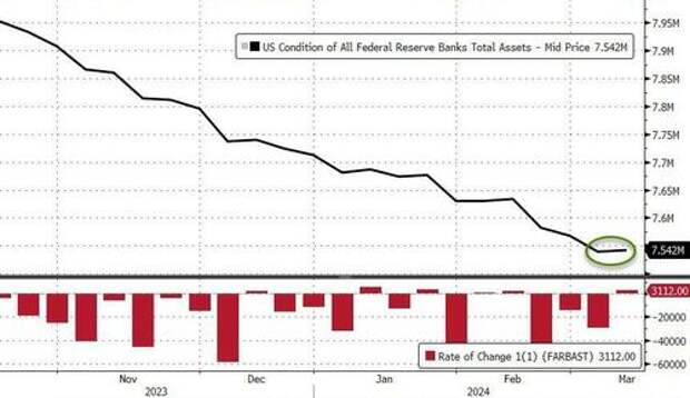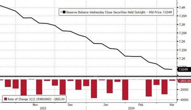 QT continued but at a much more glacial pace, down just $2.85BN last week...
