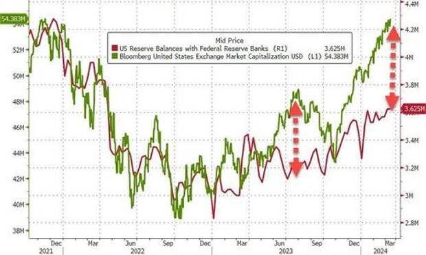 Bank reserves at The Fed were flat on the week with equity market cap as dramatically decoupled as it was in July of last year...
