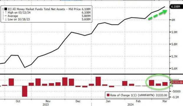 Despite soaring stocks, money-market fund assets soared to yet another fresh record high for the third straight week, adding $31BN to $6.11TN (over $100BN in three weeks)...