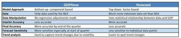 The data feeding the model is not predicted; it’s actual data. Therefore, GDPNow estimates at the beginning of a quarter are based on limited data and can result in volatile forecasts. For example, GDPNow fell from +2.5% to -1.8%, solely on the net trade balance data in late February. While it is volatile early in periods, it does tend to produce more accurate forecasts than Nowcast after the quarter ends.