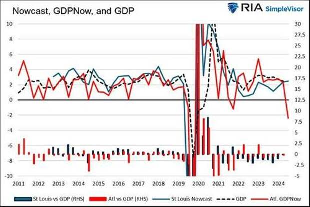 We rely on both models as they provide insight and a more balanced view. Relying on only one model can produce a flawed opinion. For instance, GDPNow warns that GDP could be below zero if specific figures, like the trade balance, remain skewed for the remainder of the month. However, the Nowcast models inform us that the broader economy is generally in good shape. If Nowcast starts rapidly catching down to GDPNow, our economic concern will rise appreciably.